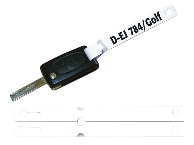 Bílé papírové visačky na klíče (ze syntetického papíru - Telsinu) jsou velkou pomůckou pro autosalony, autobazary i autoservisy pro snadnou identifikaci klíčů. Jednoduše pak poznáte, kterému klientovi / autu klíček patří. Permanentním fixem napíšete na cedulku na klíče SPZ či ID a nemusíte řešit smývání, ušpiněné prsty apod. Instalace je snadná, provlečete proužek okem klíčku a pak průvlečným okem jmenovky. Při předávání klíčů klientovi jmenovku snadno přestřihnete nůžkami. Perfektní / snadné / levné = ideální řešení téměř pro každého.