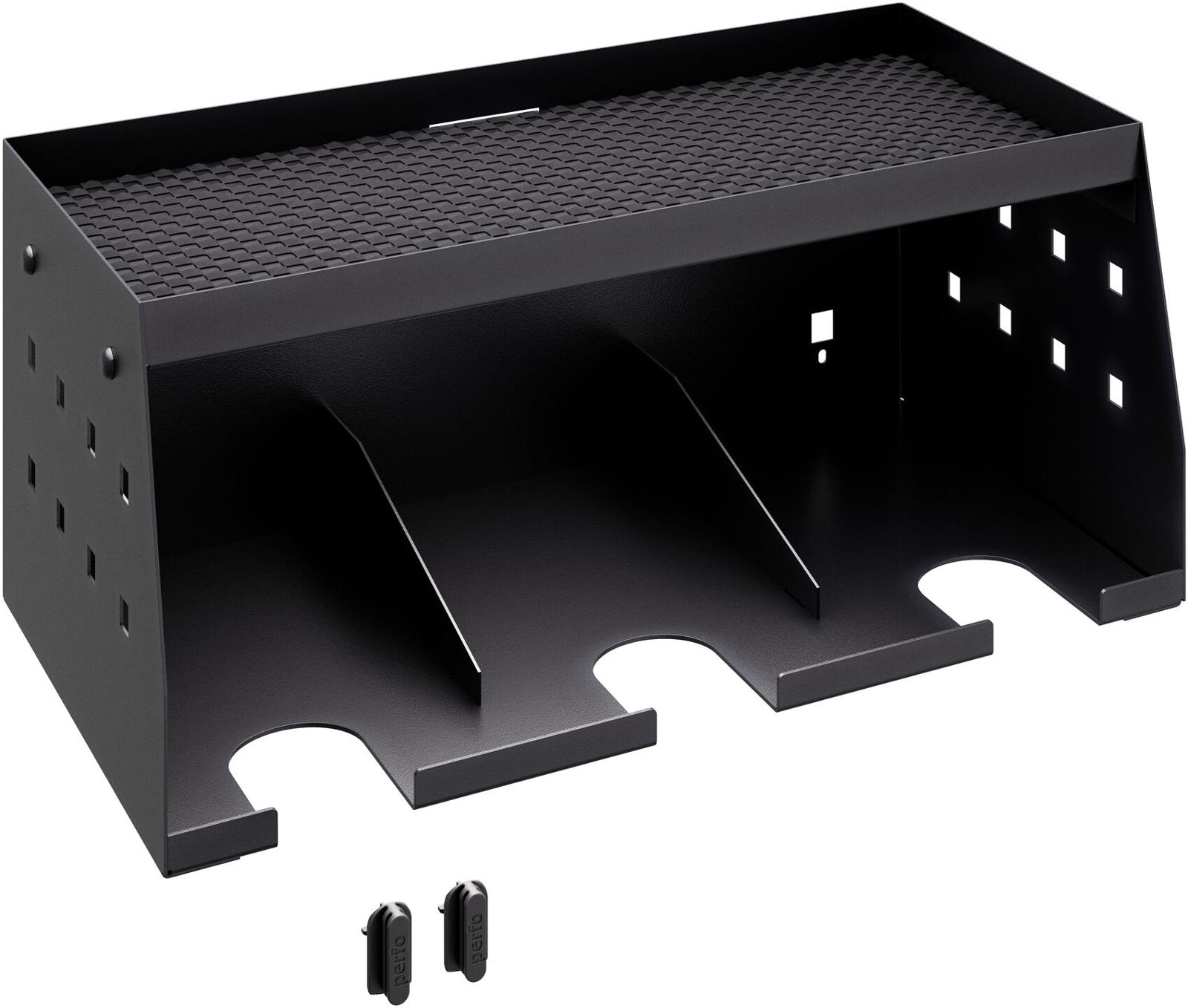 Horní odkládací plocha poskytuje dostatek místa pro nabíječky a další akumulátory, zatímco spodní výřezy umožňují zavěšení až 3 aku vrtaček nebo šroubováků.