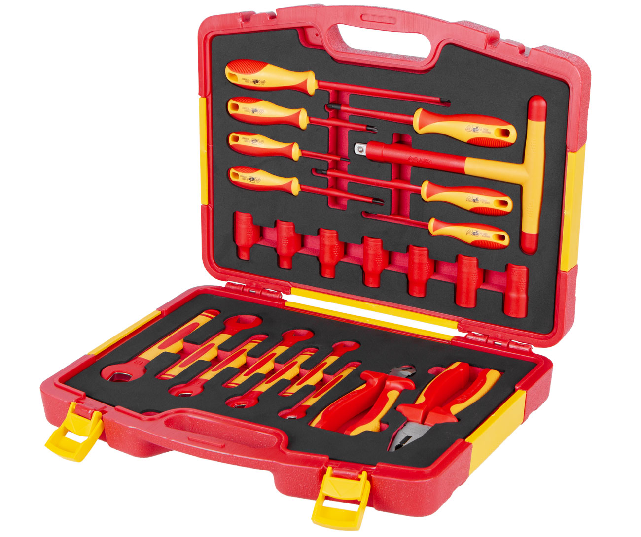 Komplexní sada VDE nářadí s plochými klíči, šroubováky, hlavicemi i kleštěmi, bezpečně uložená v plastovém kufru s tvarovanou pěnovou výplní.