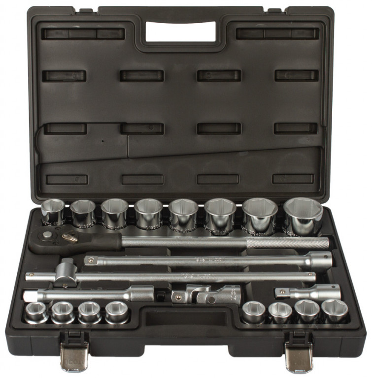 16 x nástrčný klíč: 19, 21, 22, 23, 24, 26, 27, 29, 30, 32, 35, 36, 38, 41, 46, 50 mm 1 x 20" ráčna s 24 zuby 1 x 18" vratidlo pro lepší páku 3 x prodlužovací nástavec - 4", 8" a 16" 1 x kardanový kloub pro flexibilní přístup