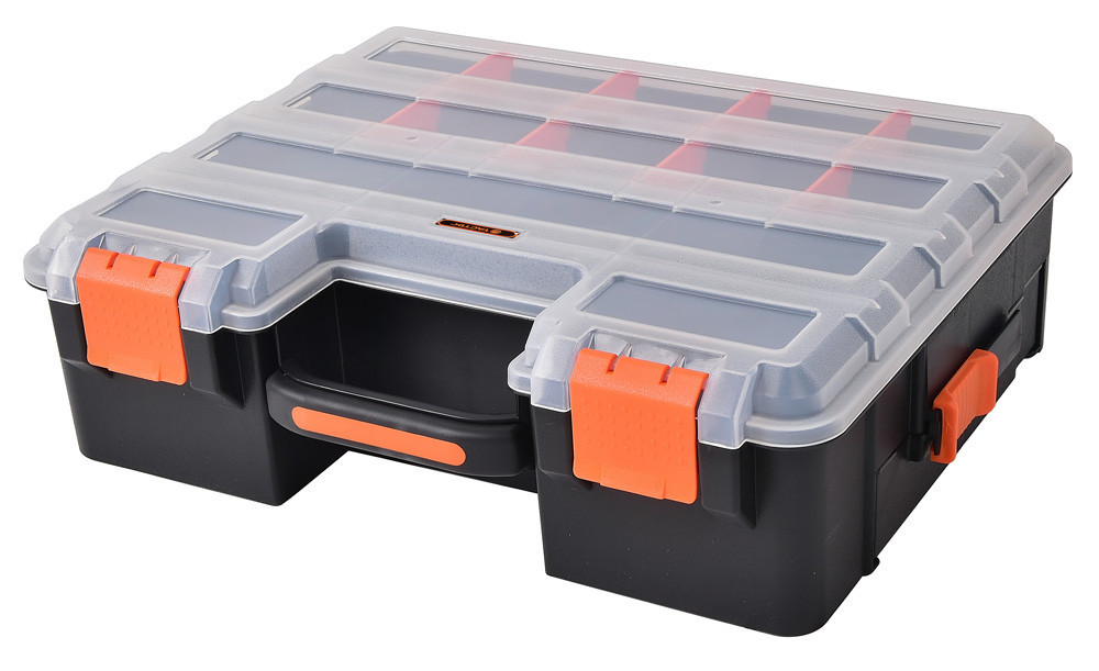 Hluboký plastový organizér s bočními šuplíky na drobný materiál jako jsou například šroubky či matice.