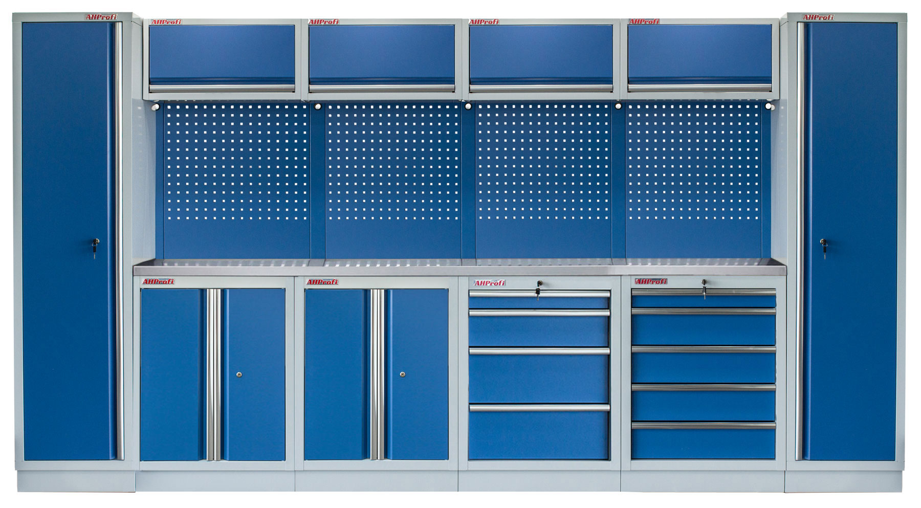 Dílenský nábytek PROFI BLUE s nerezovou deskou zaujme moderním a profesionálním vzhledem. Kombinace modré RAL 5023 a šedé RAL 7035 barvy se bude vyjímat v každé garáži i dílně.