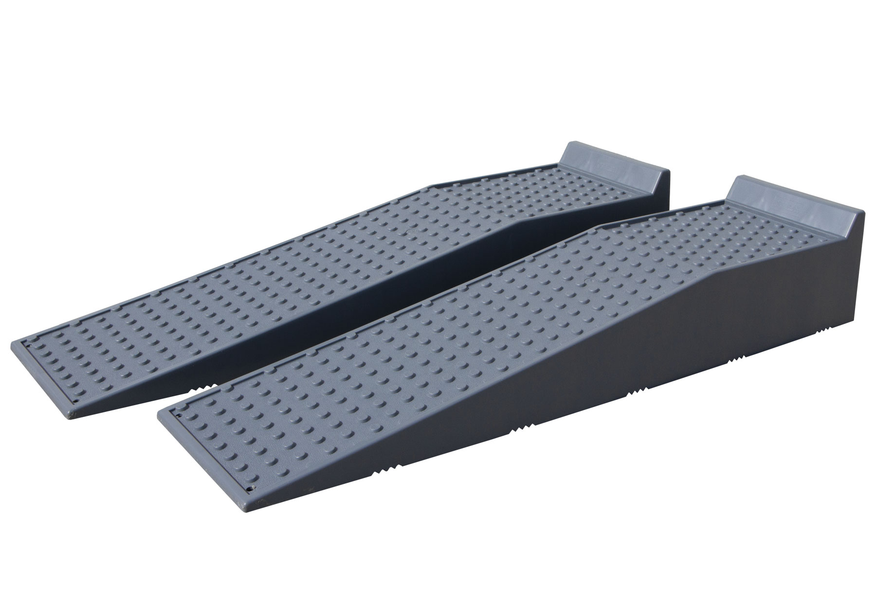 Rampy jsou opatřeny otvory pro připevnění k zemi pro lepší stabilitu a pro lepší přilnavost pneumatik jsou opatřeny drážkami na nájezdové ploše.