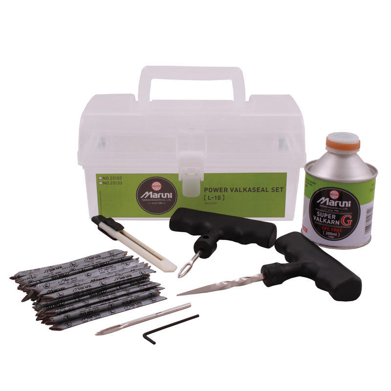 Set obsahuje 50 opravných knotů, vulkanizační roztok a další potřebné nástroje na opravu propíchnutých pneumatik.