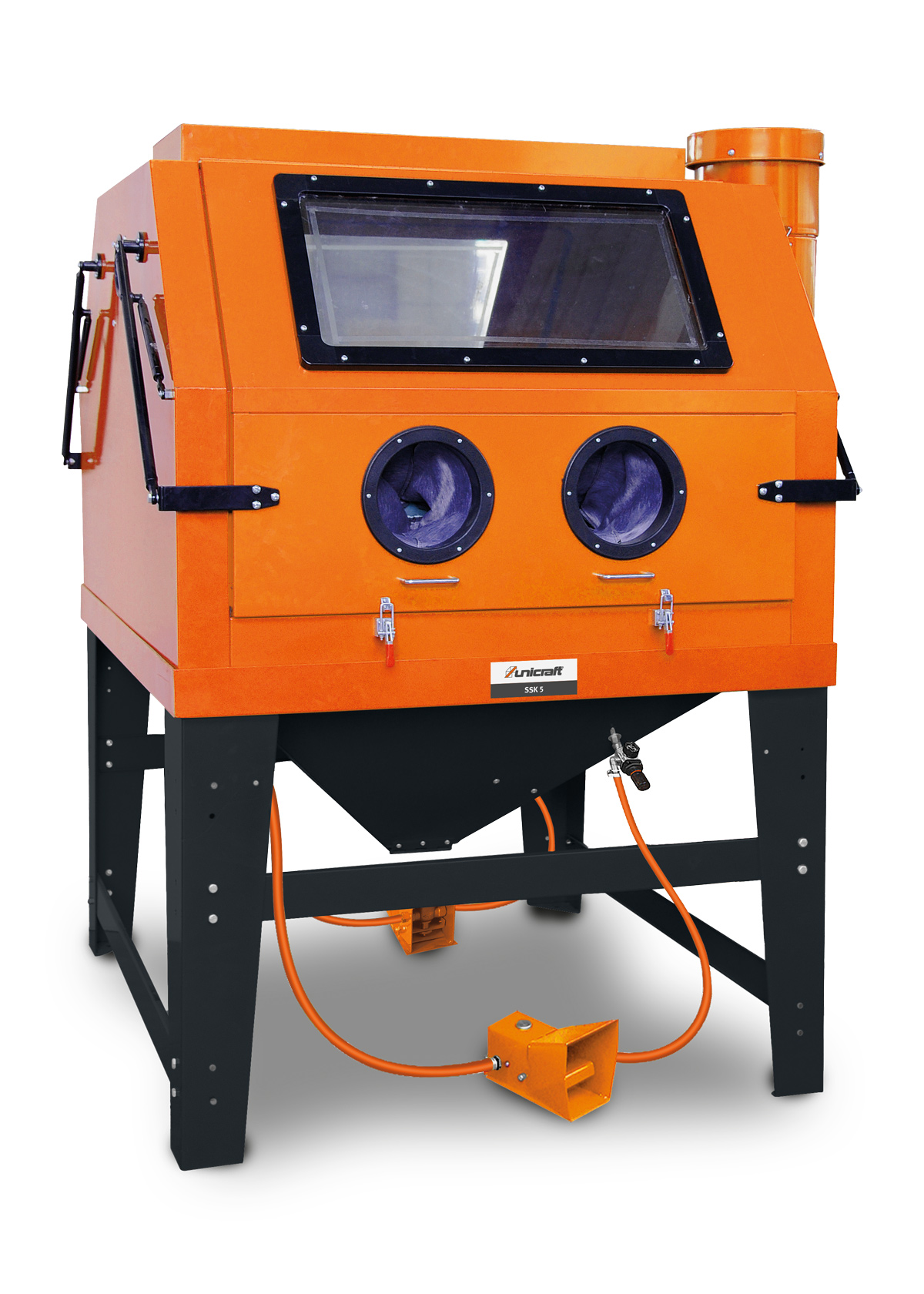 Samostatně stojící box s aktivním odsáváním pro pískování středně velkých předmětů.