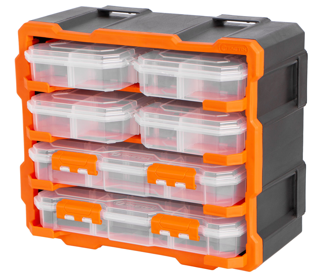 Praktický organizér navržený pro přehledné a bezpečné uložení spojovacího materiálu, drobného nářadí a dalších komponentů v domácích i profesionálních dílnách.