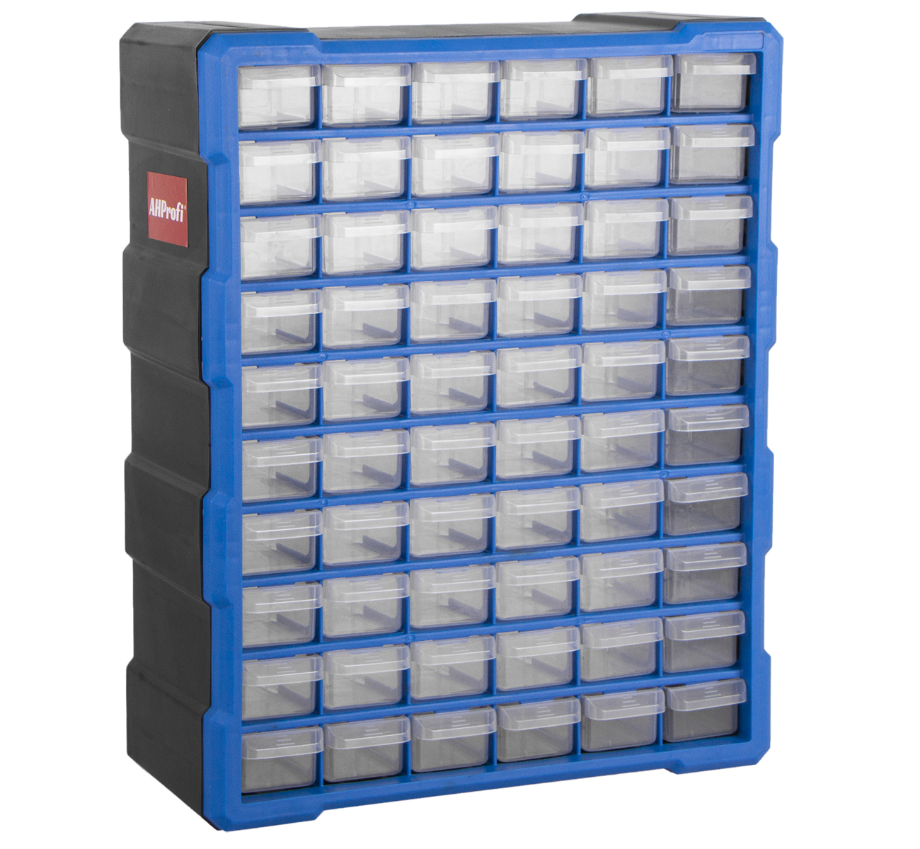 Plastový organizér s 60 zásuvkami lze jednoduše zavěsit na zeď, nebo např. z boku skříně, dílenského vozíku apod. Je možné ho postavit na ponk, nebo pracovní stůl a slouží pro uložení montážního materiálu a drobného dílenského vybavení.