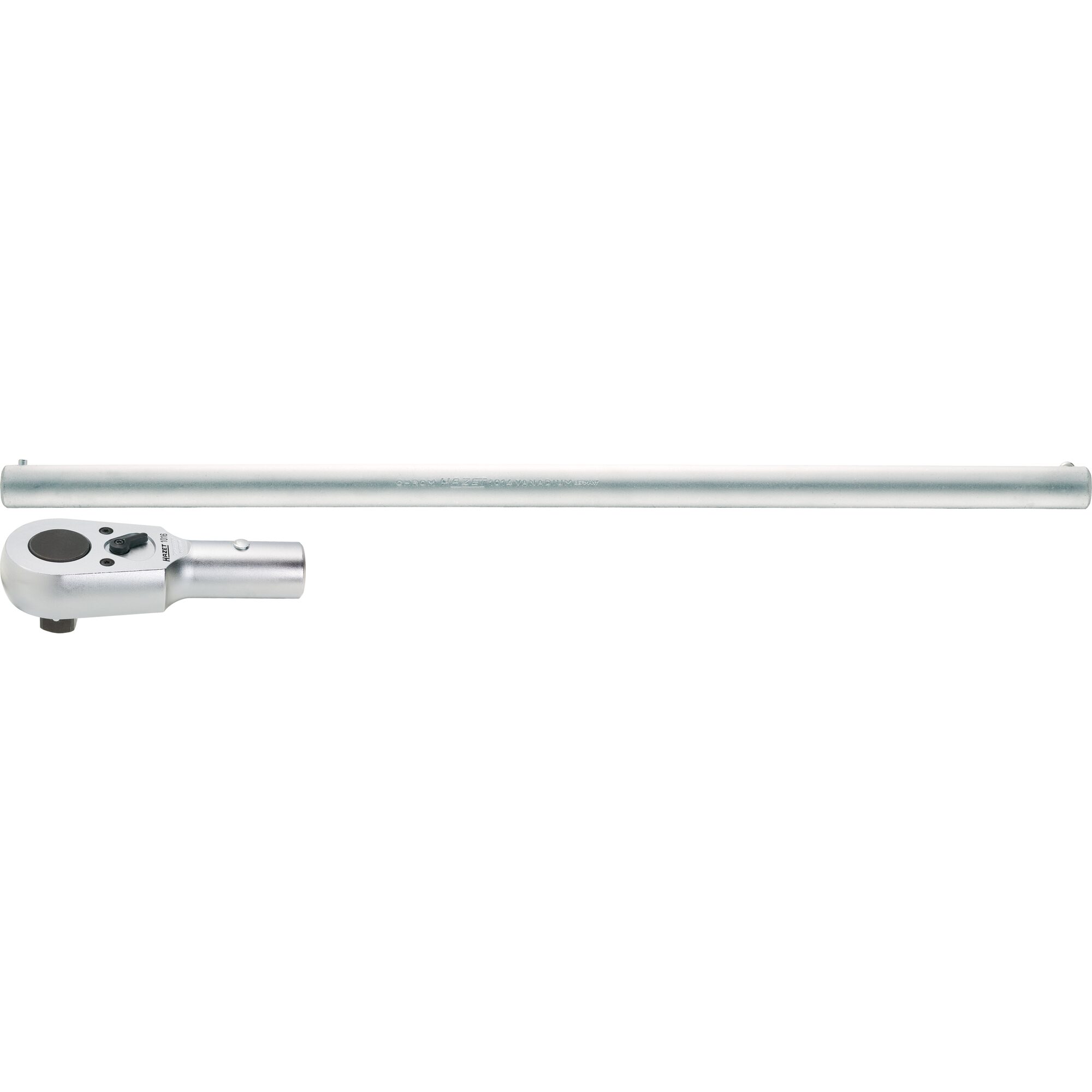 Konstrukce zahrnuje přesný ráčnový mechanismus s vnějším čtyřhranem 3/4" a dlouhou otočnou tyčí pro efektivní přenos síly i při práci s velkými momenty.