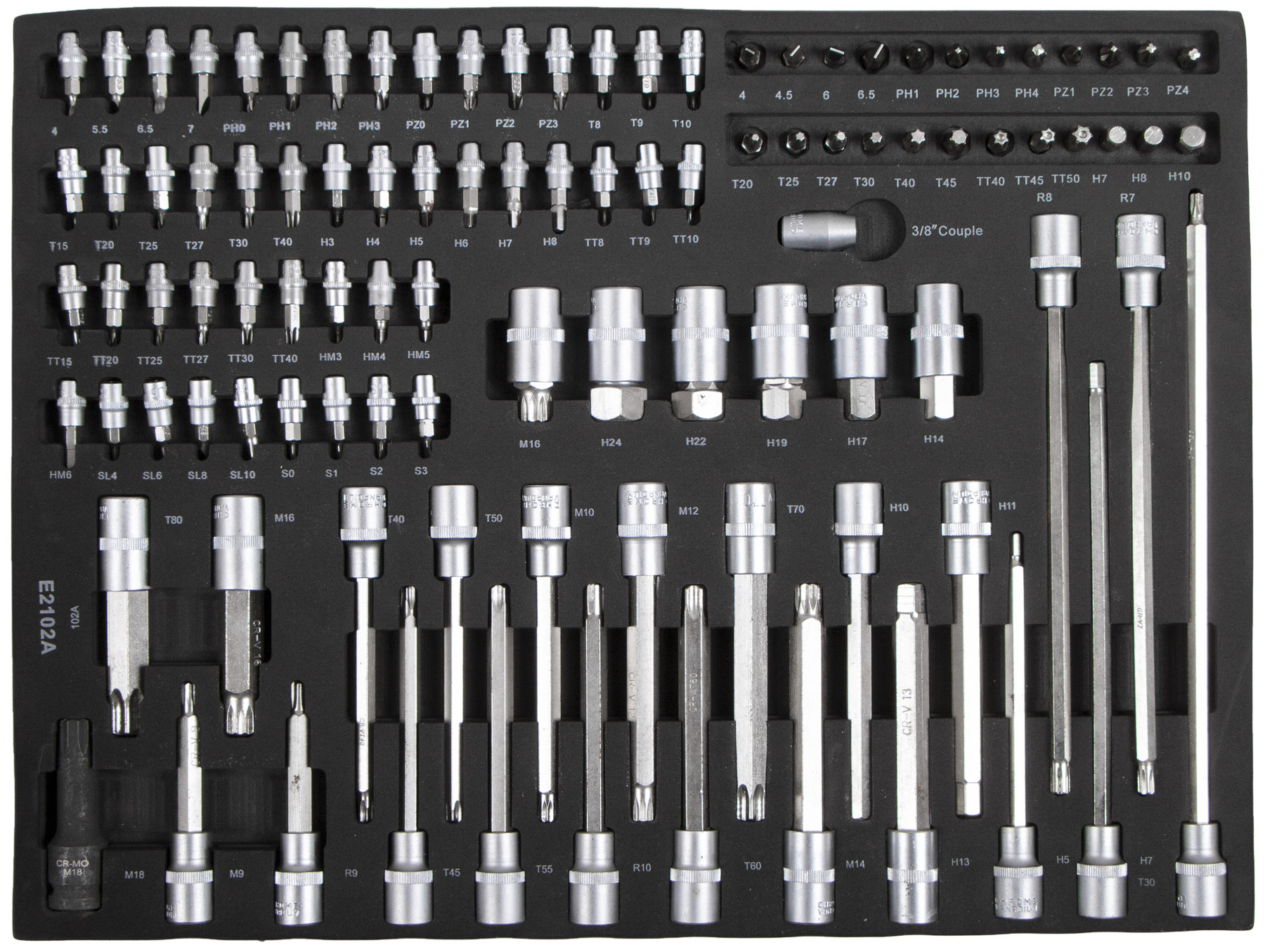 Sada 102 ks bitů v pěnové výplni do dílenského vozíku obsahuje: