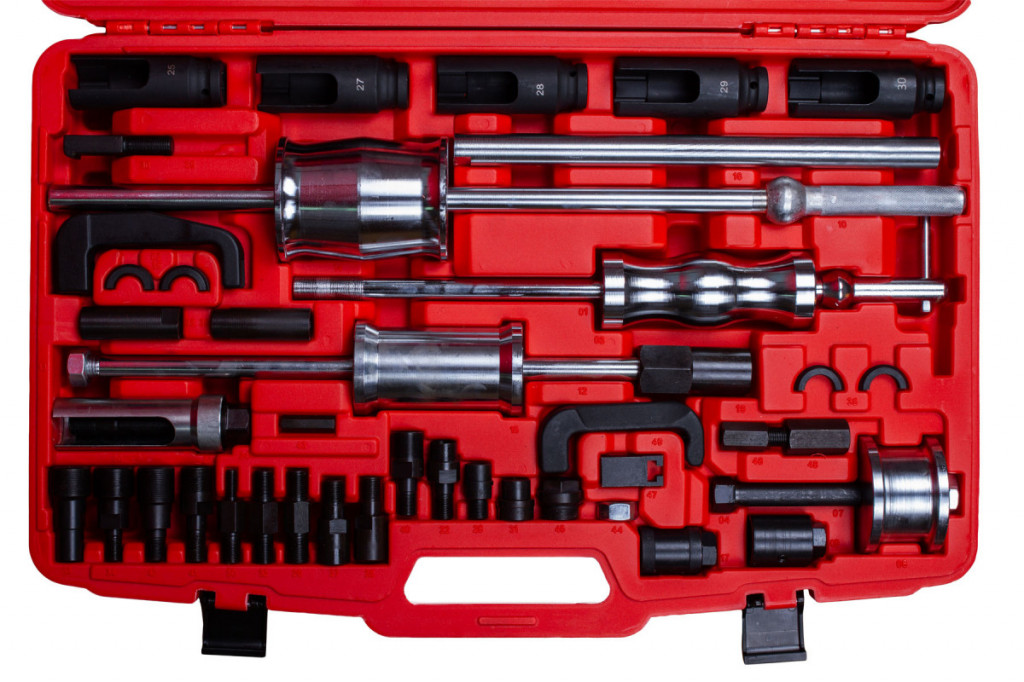 Balení obsahuje tři reverzní kladiva, klíče na vstřikovače, vytahovací vidlice a řadu adaptérů, díky tomu lze sadu použít na nejrůznější běžné vstřikovače.