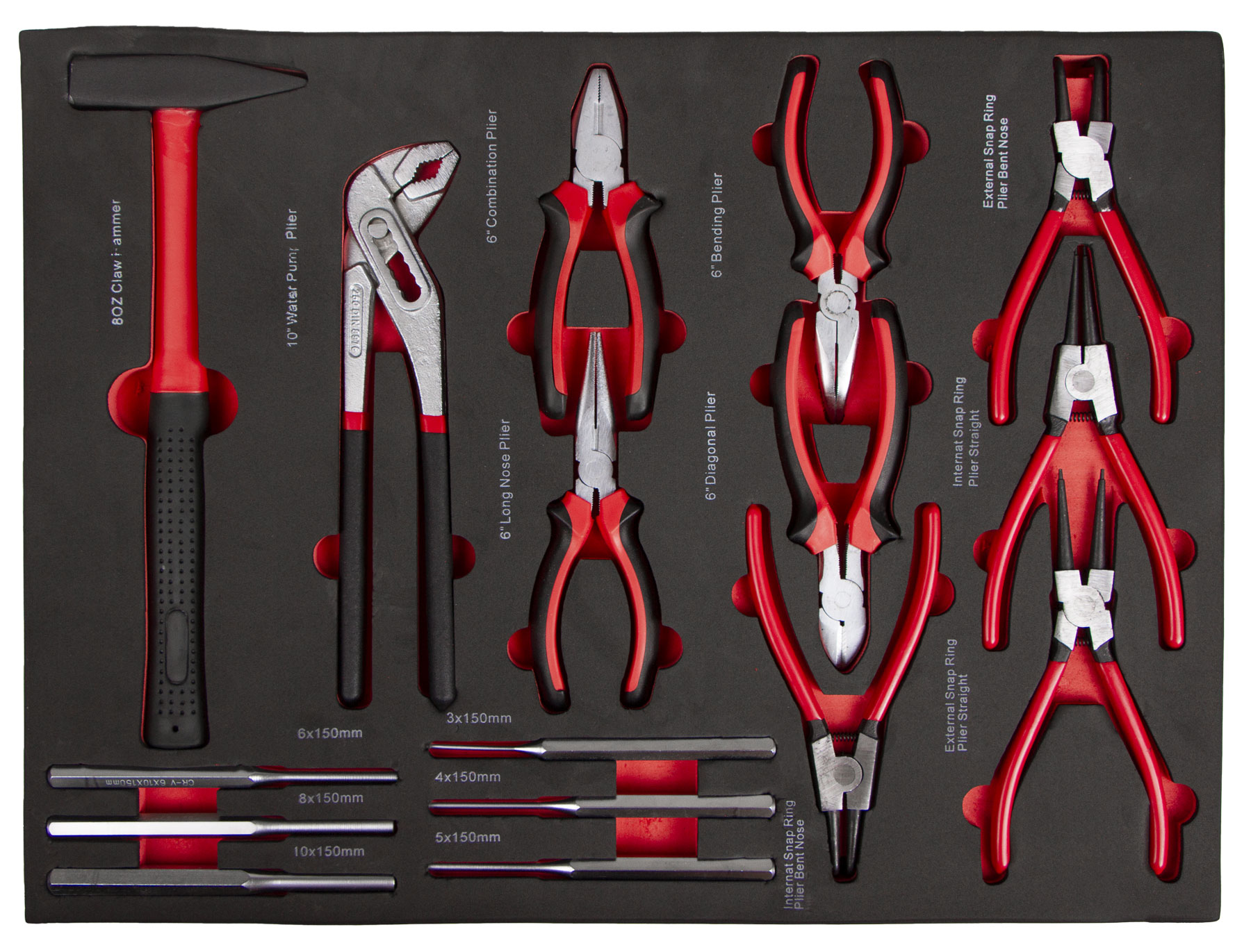 Univerzální sada kleští, vyrážečů a kladiva přehledně uložená v přesně tvarované pěnové výplni, kompatibilní s běžnými dílenskými vozíky.