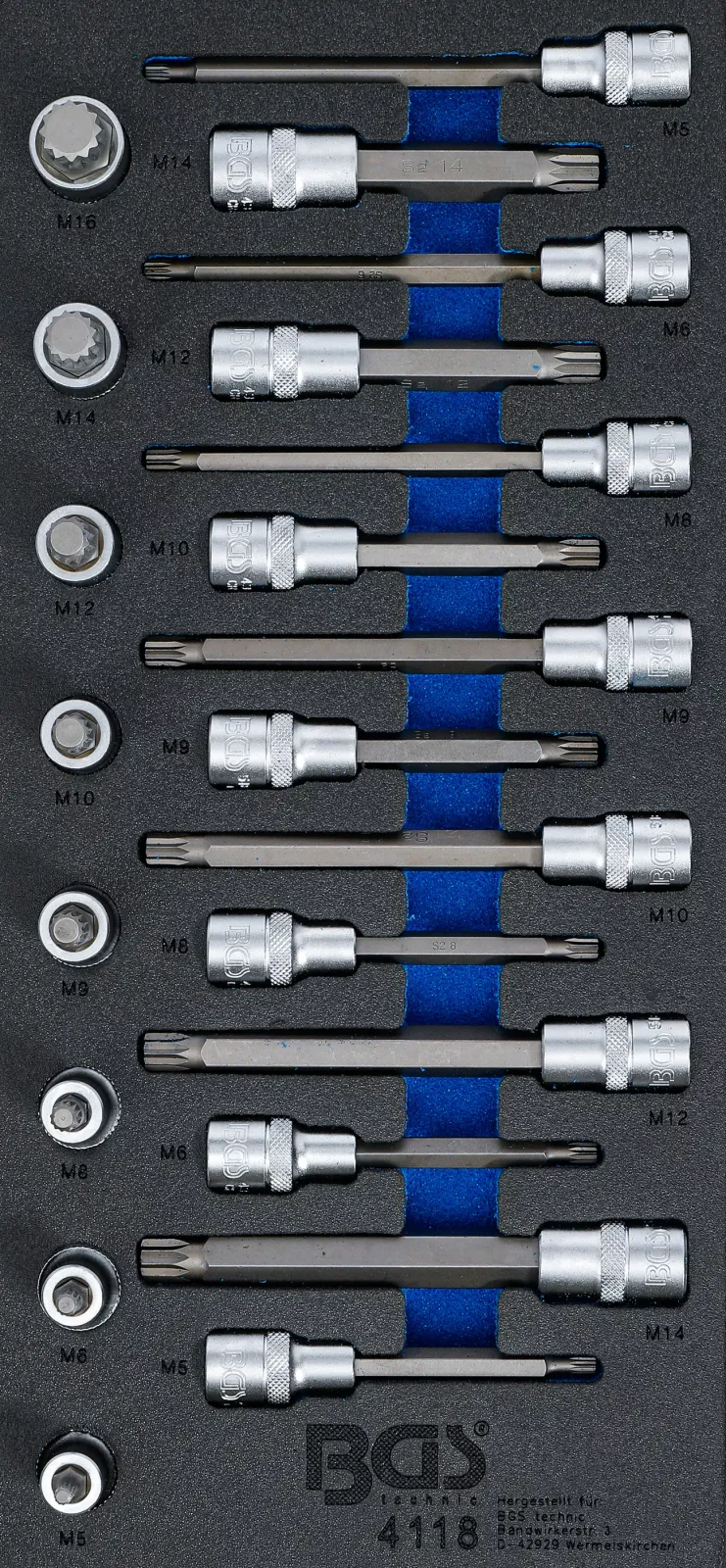 Pěnová vložka o rozměrech (š x h x v) 189 x 408 x 32 mm obsahuje celkem 22 ks nástrčných klíčů tisícihran XZN o velikostech M5 - M16.