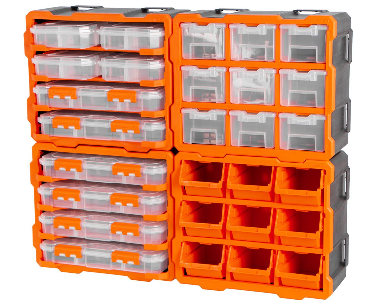 Sestava 4 modulárních organizérů značky Tactix pro profesionální a hobby použití v dílnách, garážích i domácnostech. Ideální pro uložení spojovacího materiálu, příslušenství, šroubků, podložek nebo kabelových koncovek.