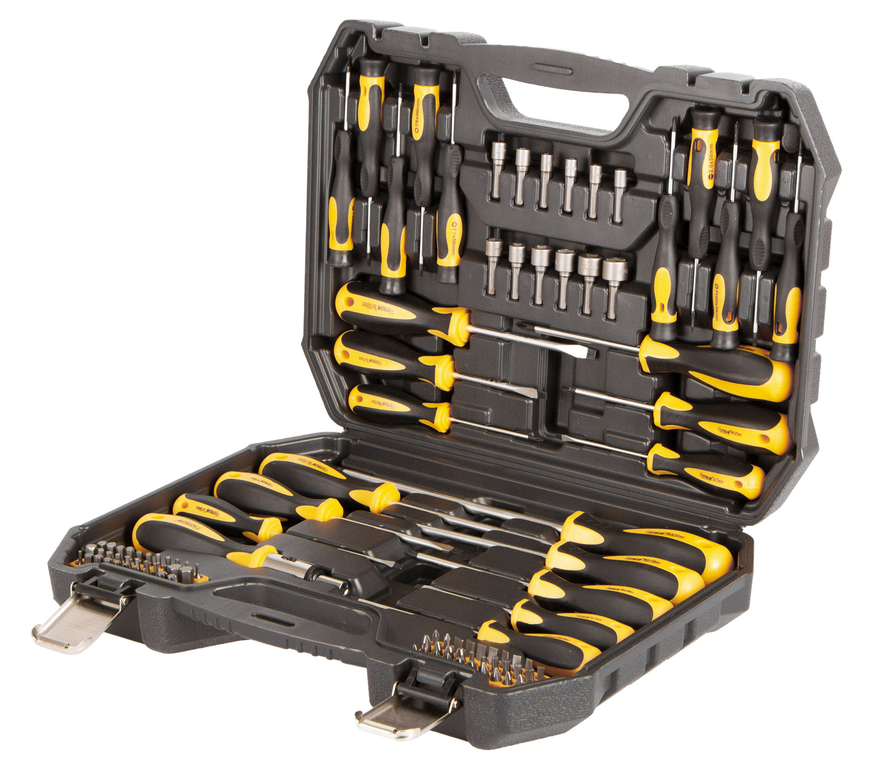Křížové šroubováky: 7 ks (PH0 × 75 mm, PH0 × 100 mm, PH1 × 75 mm, PH1 × 100 mm, PH2 × 100 mm, PH2 × 150 mm, PH3 × 200 mm)
