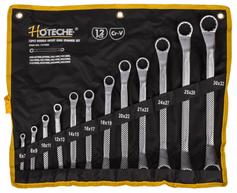 Vyhnuté očkové klíče v 12 ks sadě, která je přehledně uložena ve srolovatelném pouzdře. Díky srolování je pak sada úspornější na skladovací prostor a hodí se jak na cesty, tak na montáže. Klíče jsou vyrobeny z kvalitní chrom-vanadiové oceli.