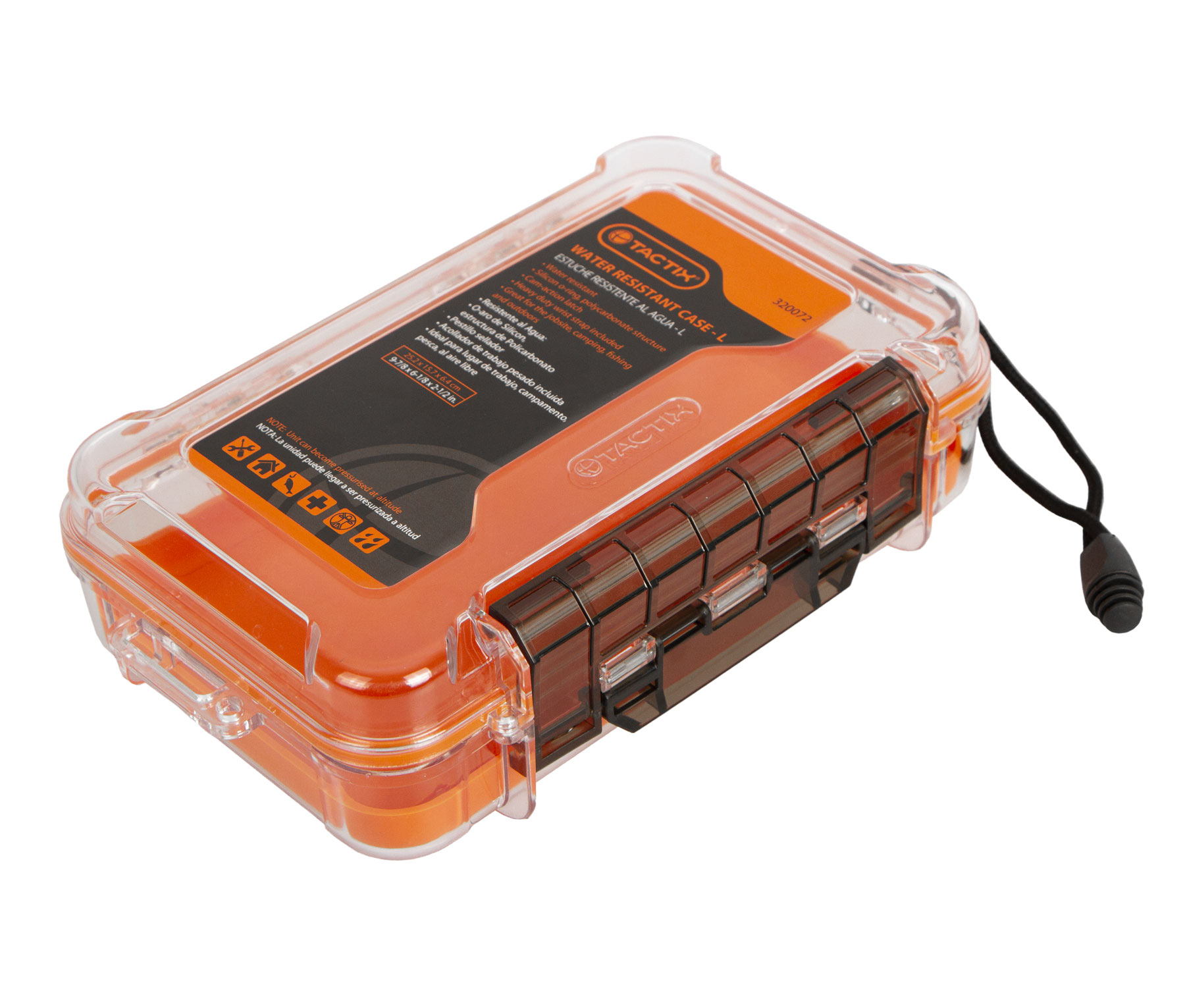 Vodotěsné pevné plastové pouzdro s poutkem pro zavěšení na zápěstí.